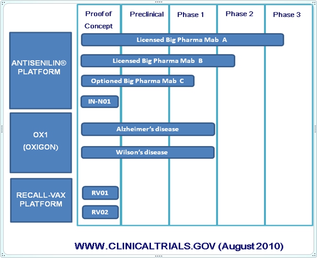 In addition, the company has two preclinical programs it is developing internally. One of these, under the ANTISENILIN platform, is IN-N01, which the Company is developing as a follow-on generation monoclonal antibody drug that it believes will have better safety and efficacy in a broader population than Bapineuzumab or Ponezumab and compared to other similar types of drugs currently in development. The resulting product has multiple potential applications for the treatment of AD, Glaucoma, Age-related Macular Degeneration and Traumatic Brain Injury, all of which have been linked to A?. The second program under the RECALL-VAX platform has yielded two AD vaccine drug candidates, RV01 and RV02. RECALL-VAX™ has the potential to delay or prevent the development of Alzheimer’s in those who are at risk by stimulating patients’ immune systems to produce antibodies that clear amyloid betas and prevent further accumulation and deposition. Many view a vaccine of this nature, which is analogous to a flu shot, as the ultimate quest in Alzheimer’s research.