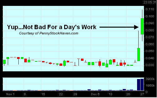 That marks over two weeks of consecutive winning penny stock alerts (via STREET SENSE) from PennyStockHaven.com. Looks like We’re 6 for 6 in that category.